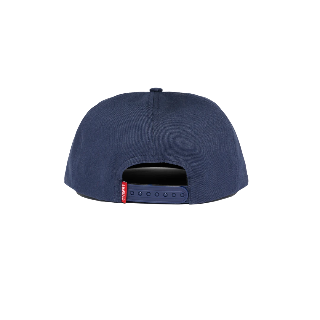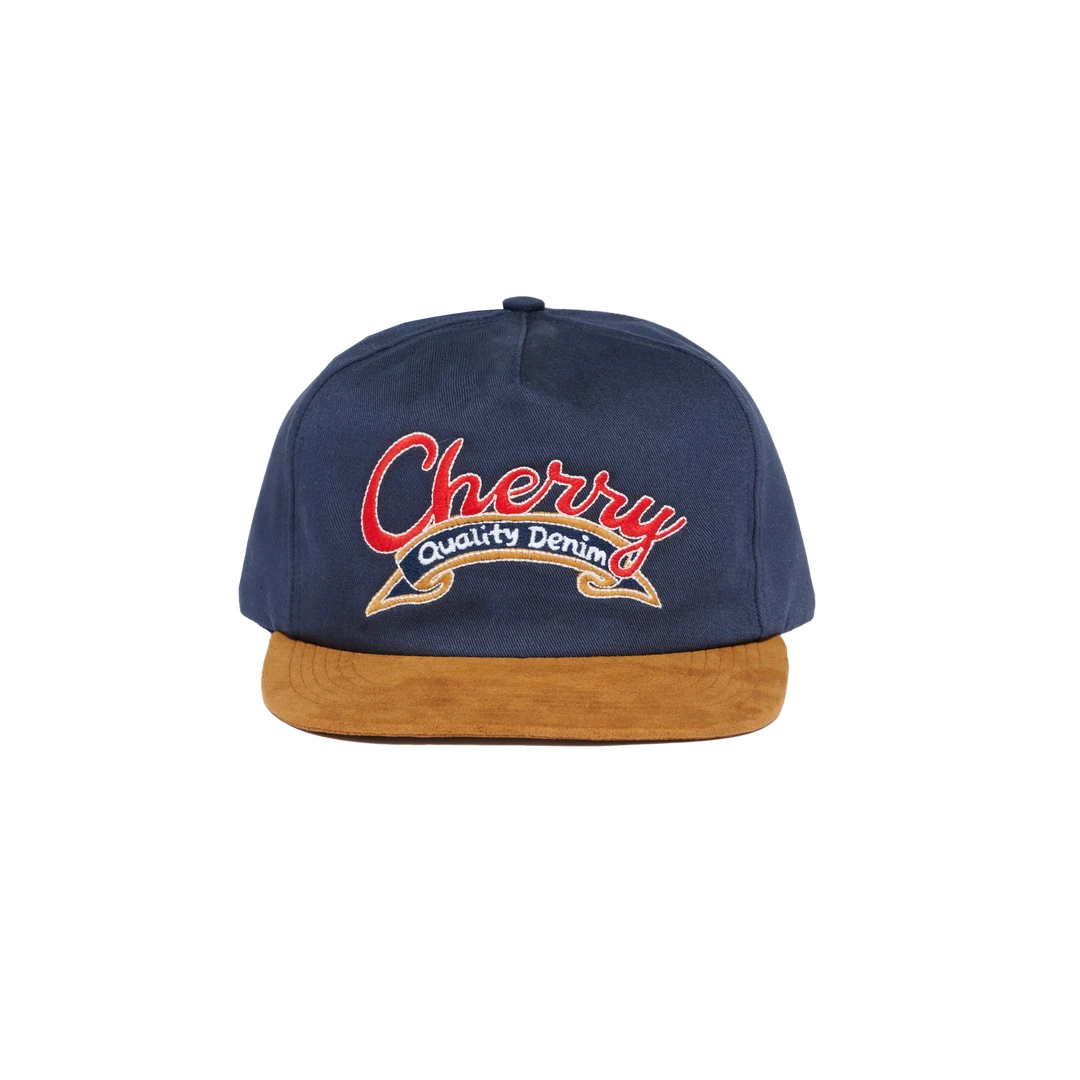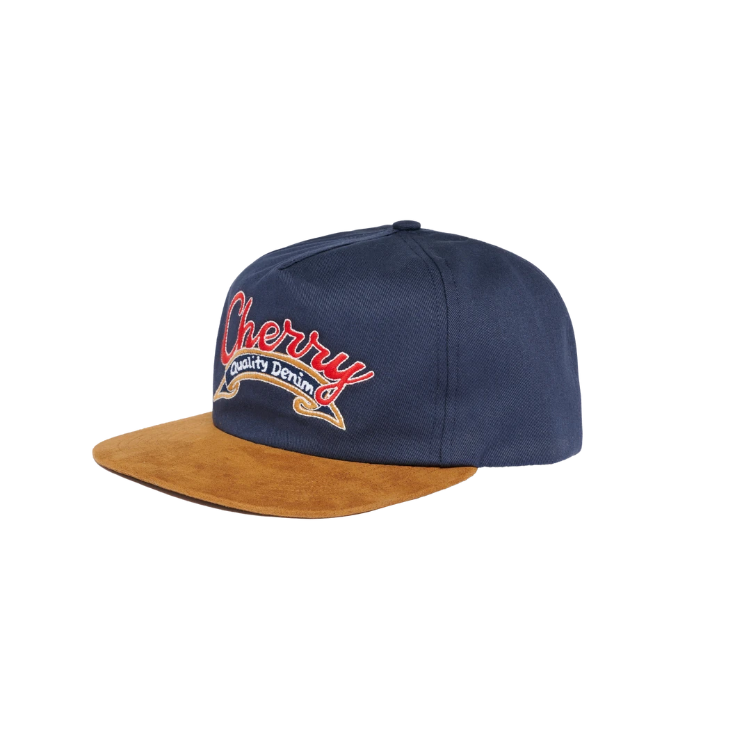 100% Cotton Twill Unstructured 5 Panel Snap Back Hat. Suede Brim. Embroidery on front panel.