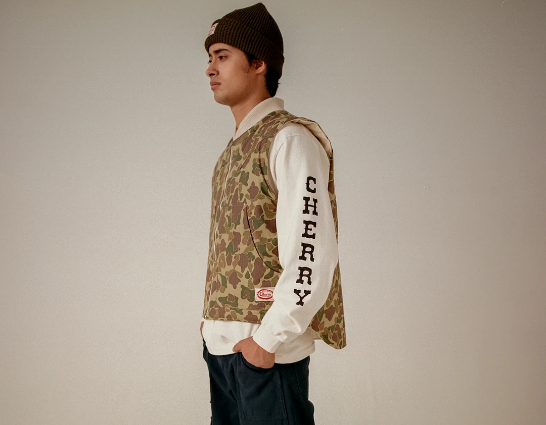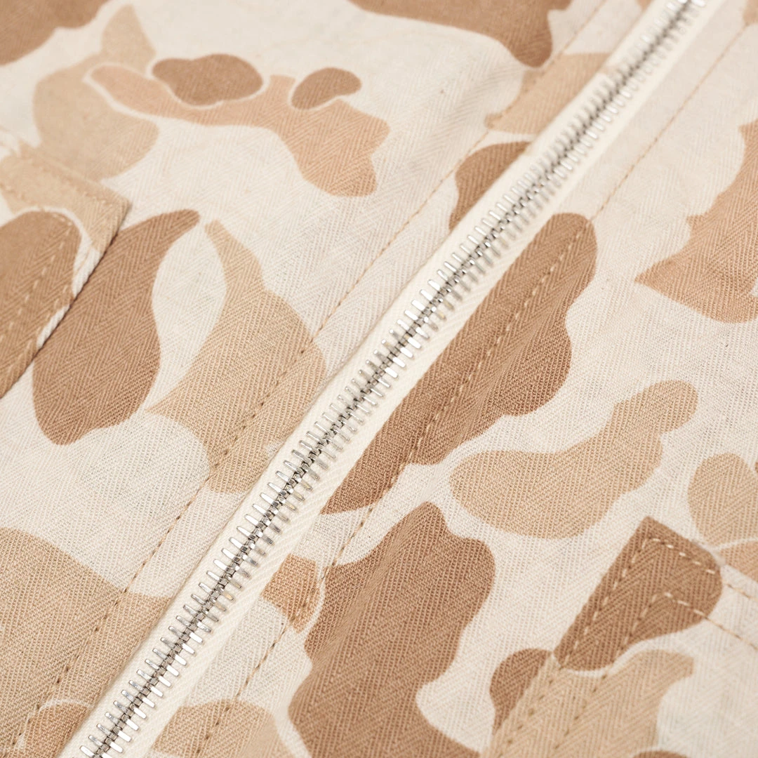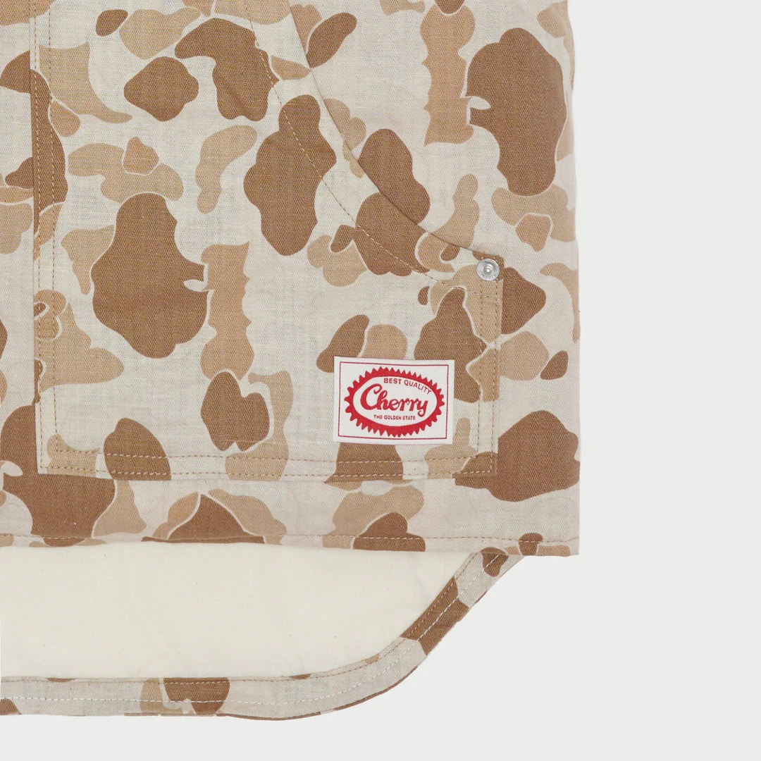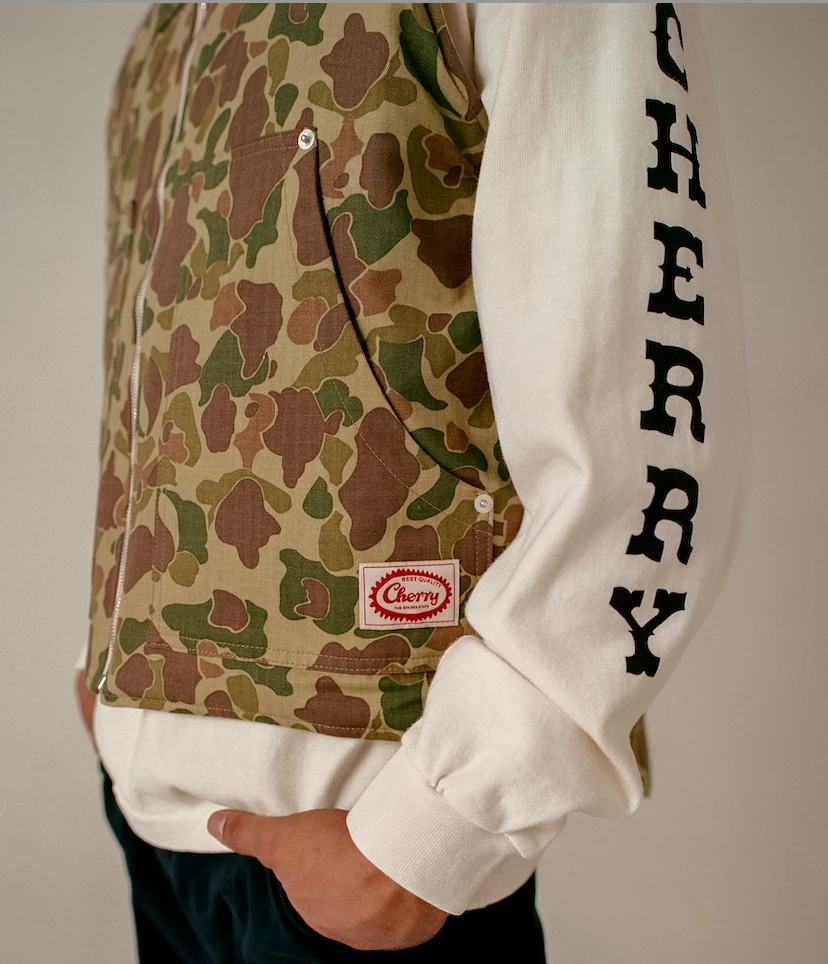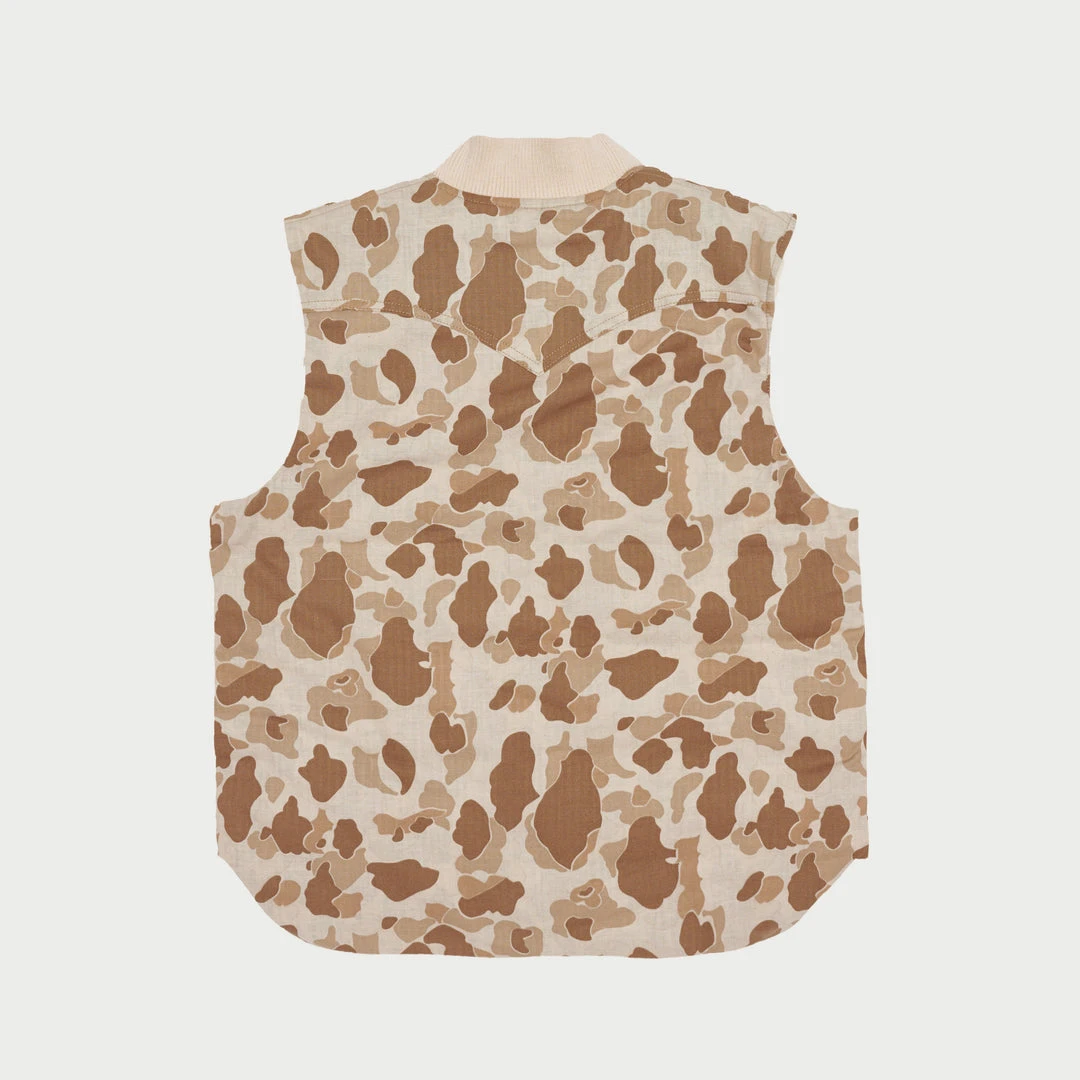 100% Cotton Herringbone Duck Camo Vest. Hand quilted lining with down insert for cold temperatures. Label on front right pocket.