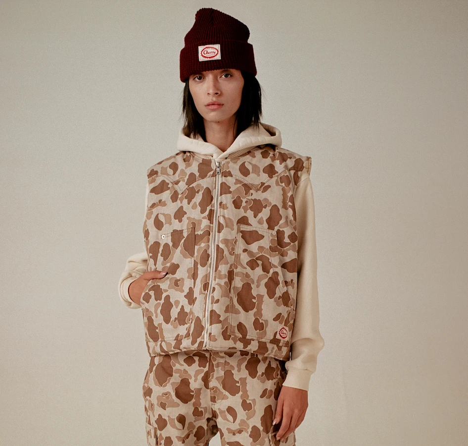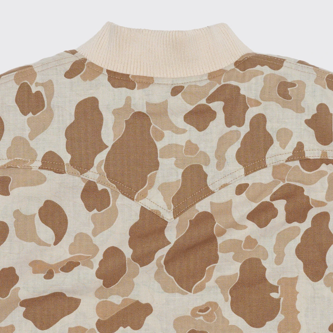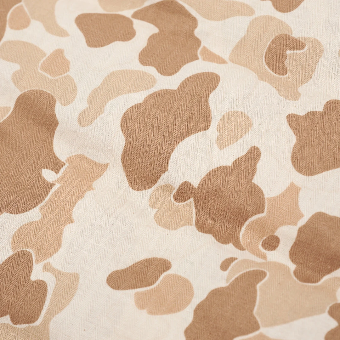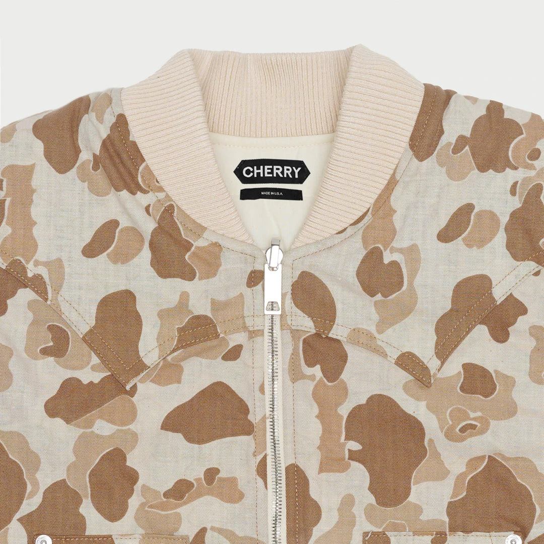 100% Cotton Herringbone Duck Camo Vest. Hand quilted lining with down insert for cold temperatures. Label on front right pocket.