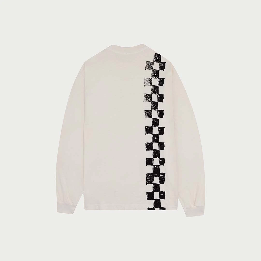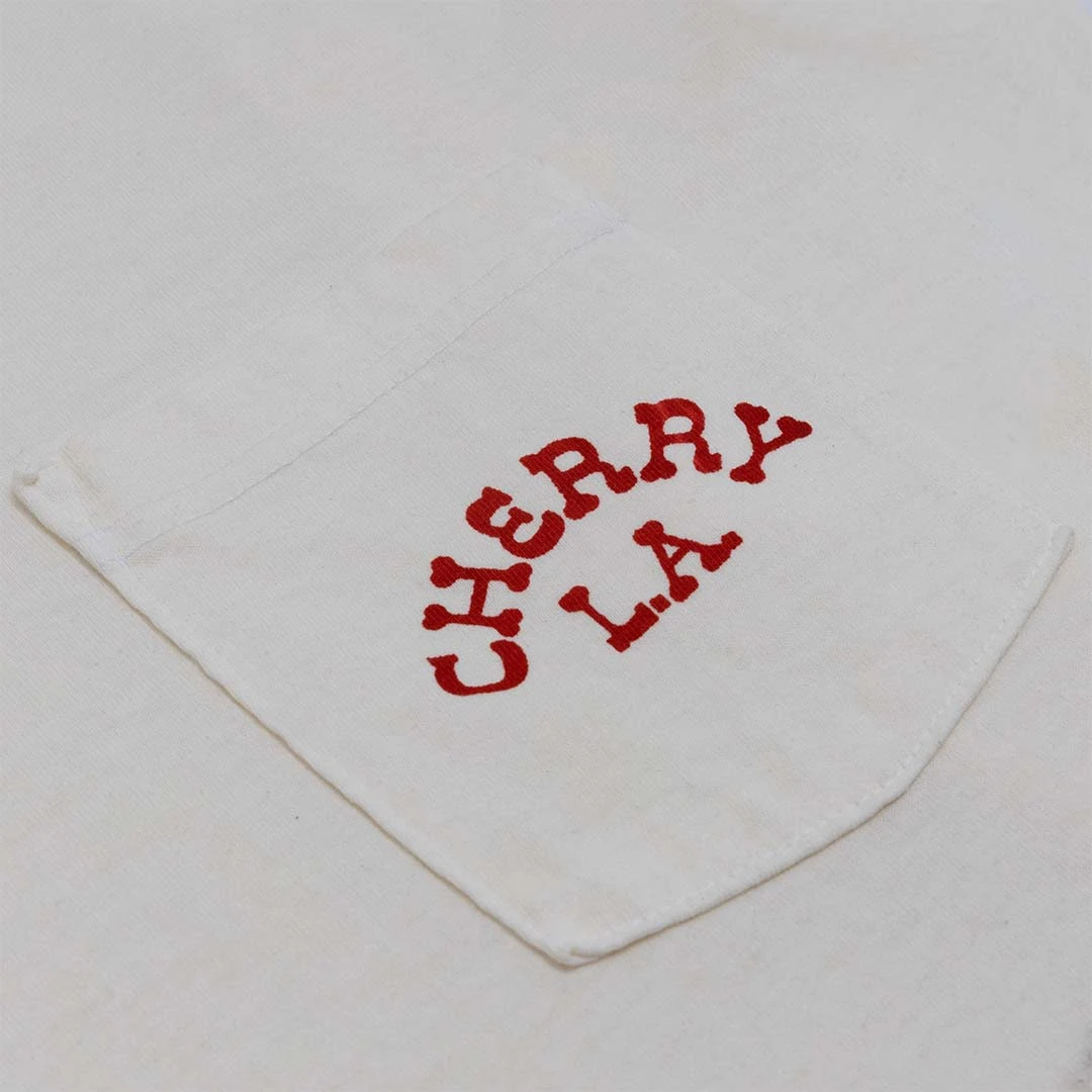 6.5oz USA 100% Cotton Long Sleeve Pocket T-Shirt. Garment dyed then washed for soft hand-feel. Hand printed with plastisol ink on front and back.