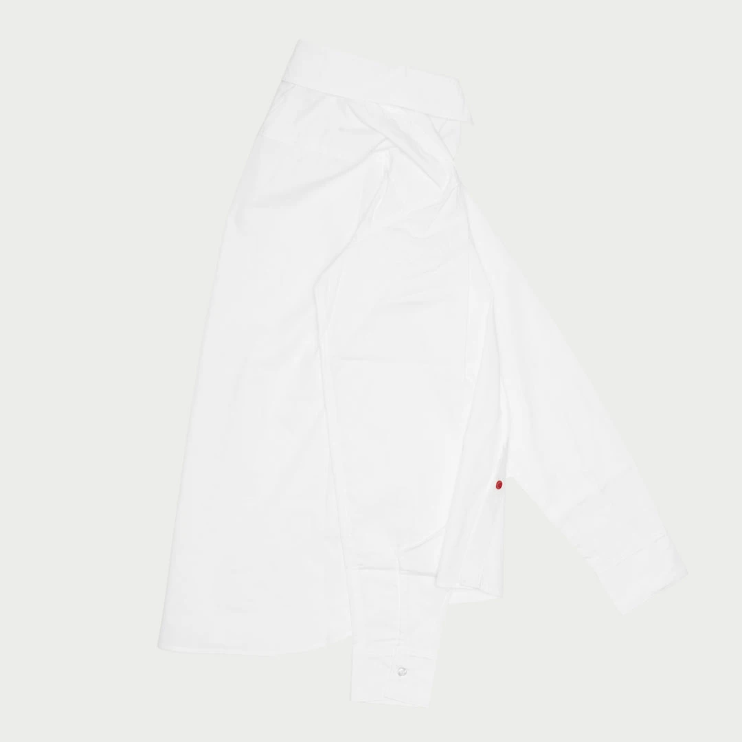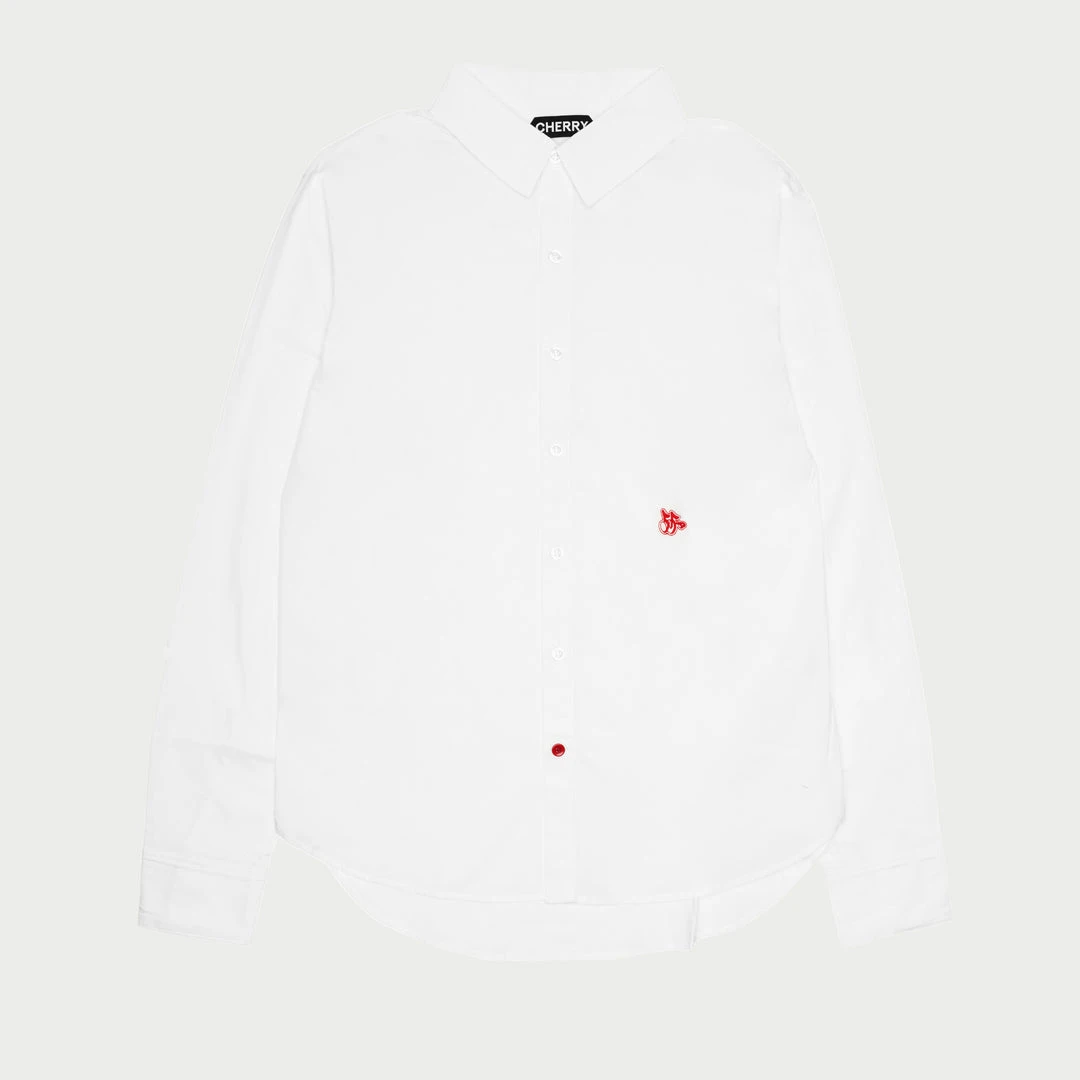 Natural shell button front with a single red accent button at the bottom, a Cherry signature.