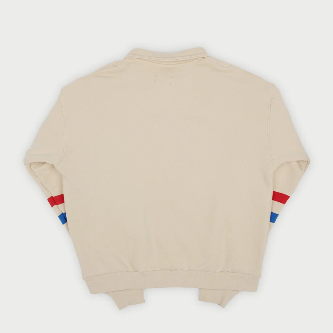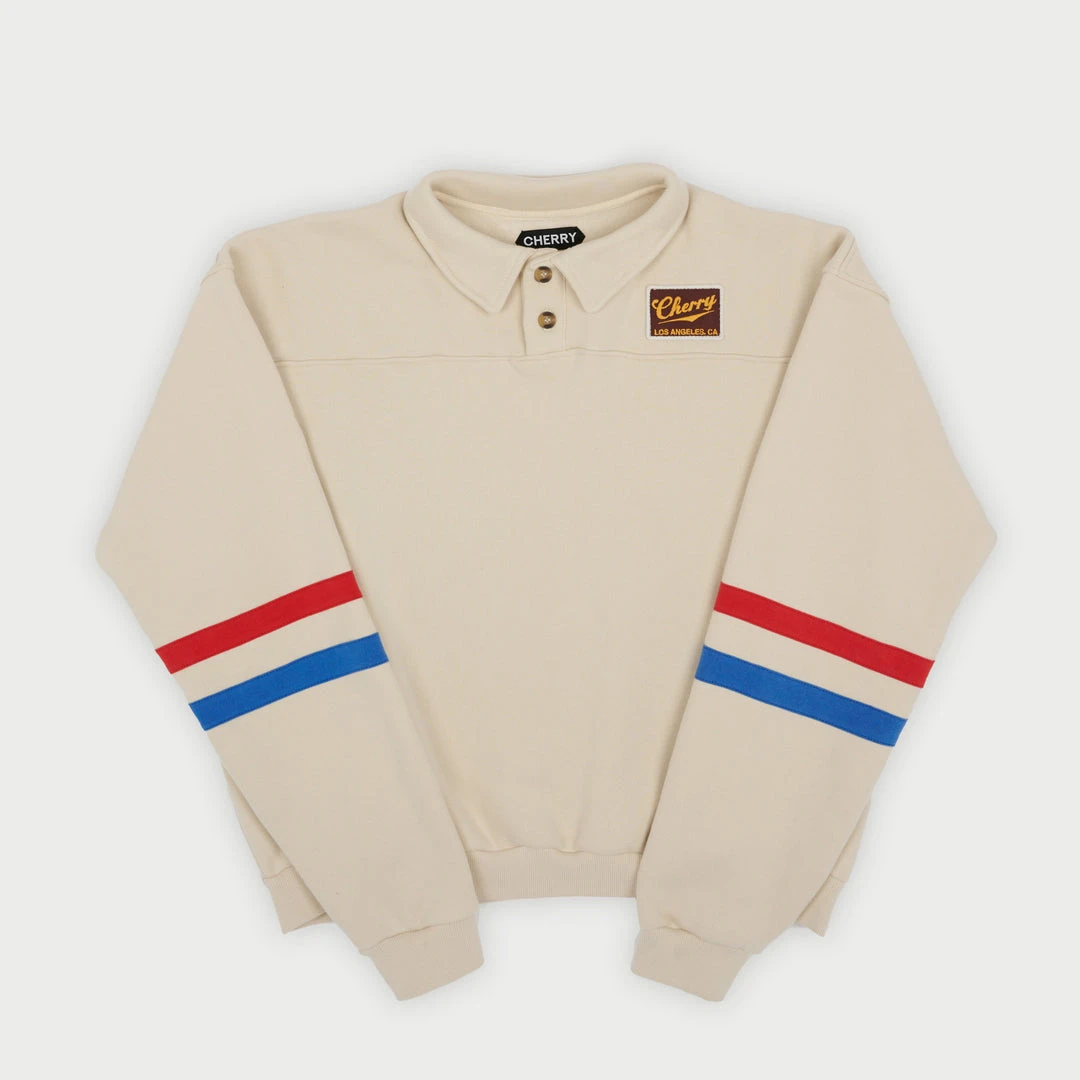 Polo Fleece Henley Made in Los Angeles. 100% Cotton Heavy Fleece. Contrast stripes on arms. Embroidered Patch on left chest. Horn Buttons.