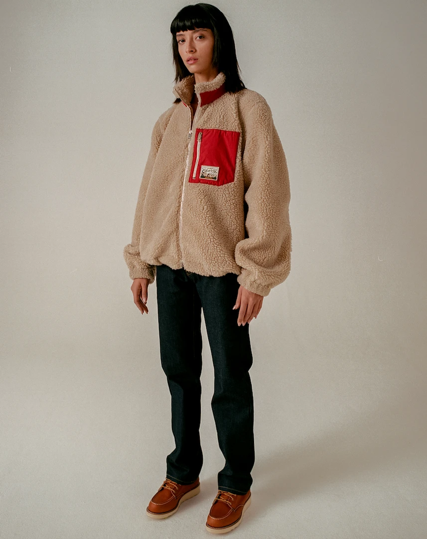 We wanted to design a sherpa that was unlike any other. The outer is a 372GSM high pile fleece thats nearly 3mm thick. The lining is a peached poly that is both warm and soft and the chain stitched is adorned on our 70/30 PU coated brushed cotton nylon. A small zipper chest pocket is perfect for holding the keys to your new Cherry Custom Chevy, and the elasticated bottom can be tightened to keep air from ridding up your belly when you’re driving it too fast. Another reimagined staple from your friends at Cherry.