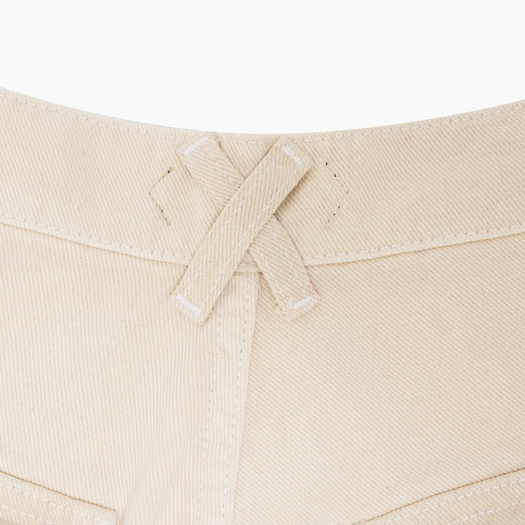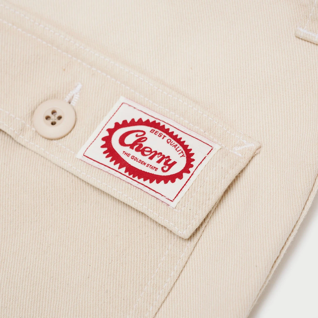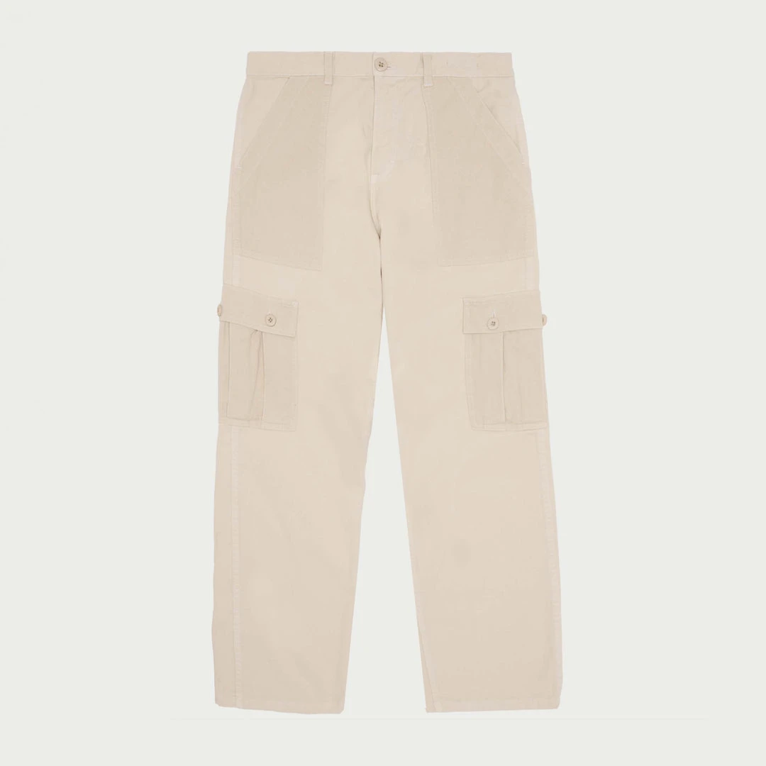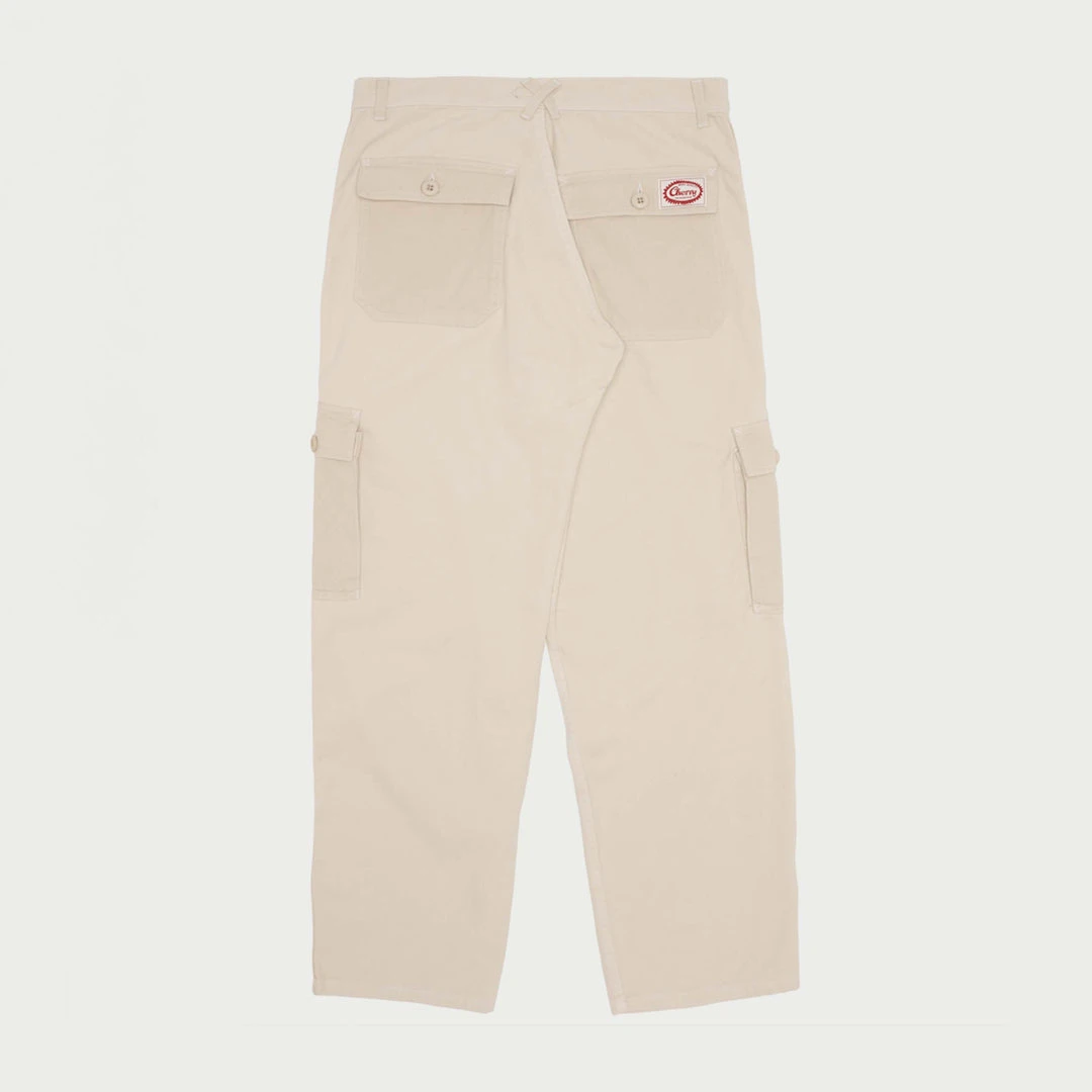 100% Cotton Twill Work Cargo Pants. Slightly contrasted pockets. Custom dyed button closure under cargo pockets and back pockets. Cherry Button closure & top and patch on back wearers right.