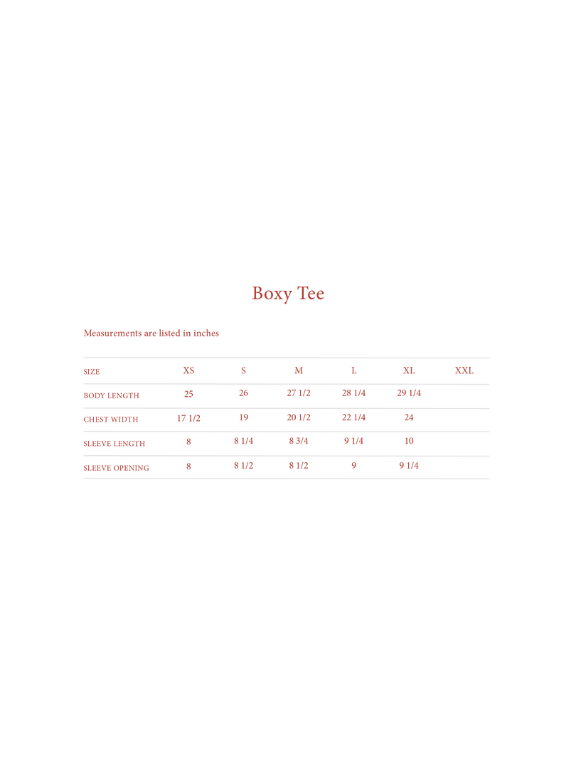 6.5oz 100% USA Cotton Boxy T-Shirt. Fits boxy and oversized, size down for more slim fit. Hand printed with plastisol ink on front. Rinsed and washed for soft hand-feel.